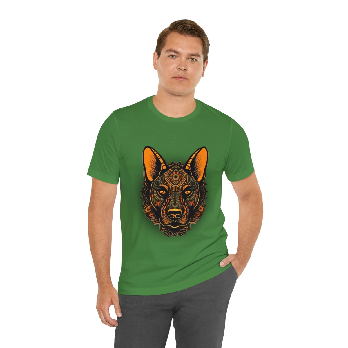 Make a bold statement with this minimalist geometric art design of a German Shepherd. The multi-colored design features muted tones of oranges, dark greens, greys, and blacks, creating a unique and eye-catching look.